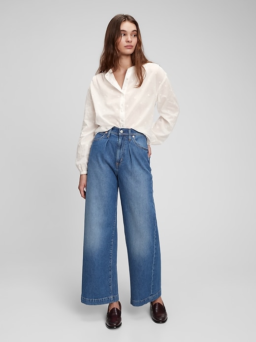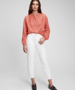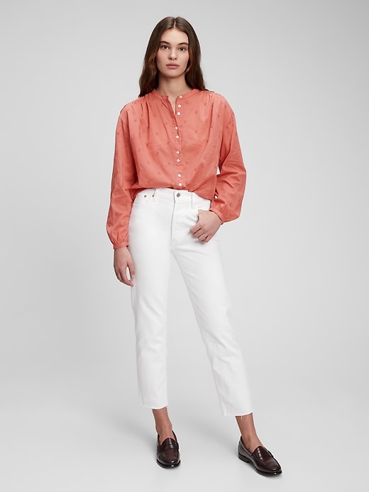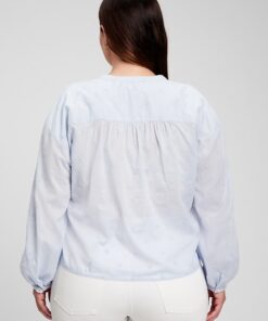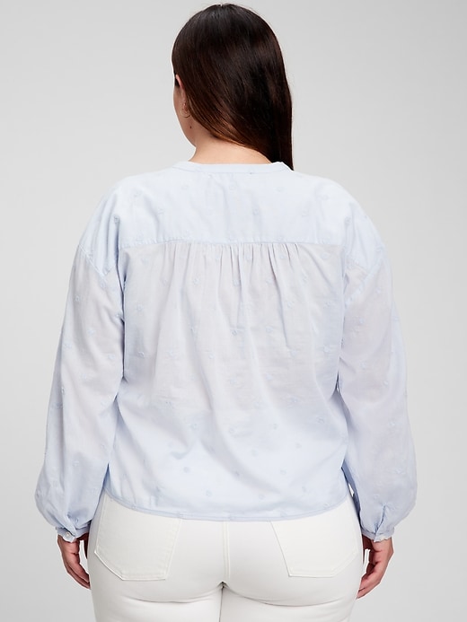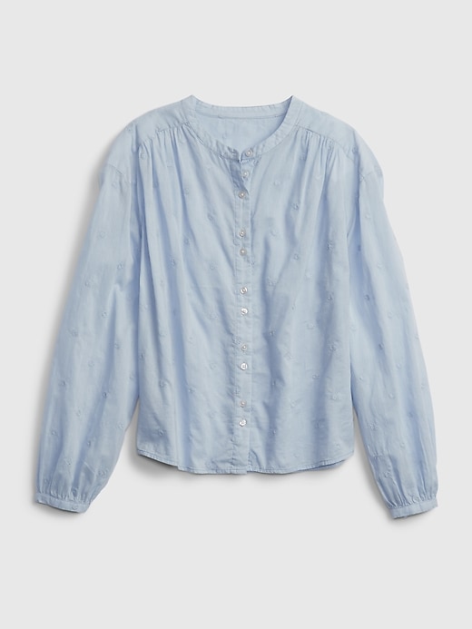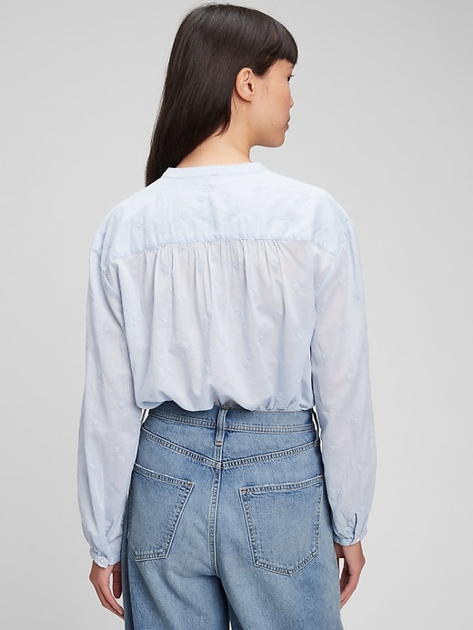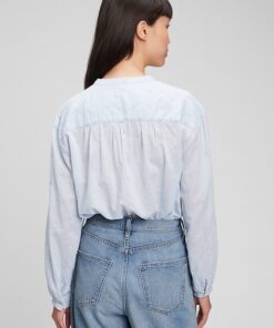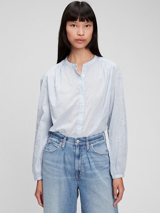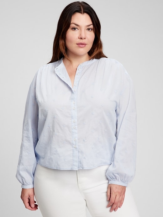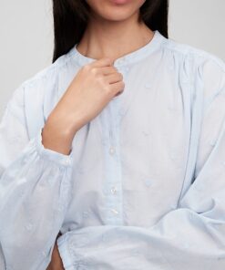 | Details | Soft woven cotton top., Long tops with shirred cuffs.,, Stand collar., Button front. ,, Delicate embroidery throughout., Shirred back seam. |