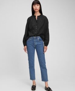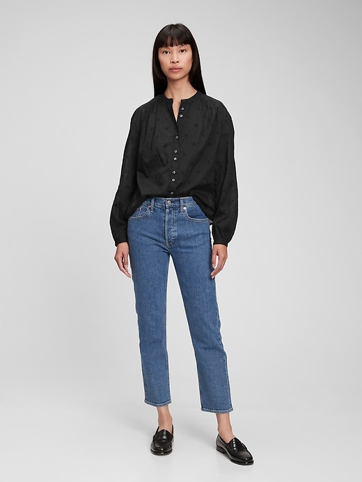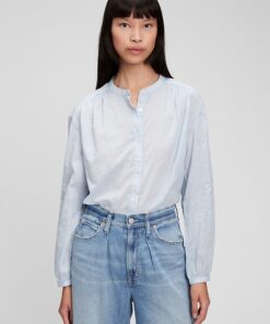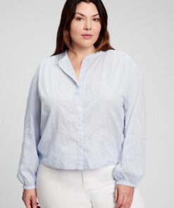 Long tops with shirred cuffs., Stand collar. , Button front. ,